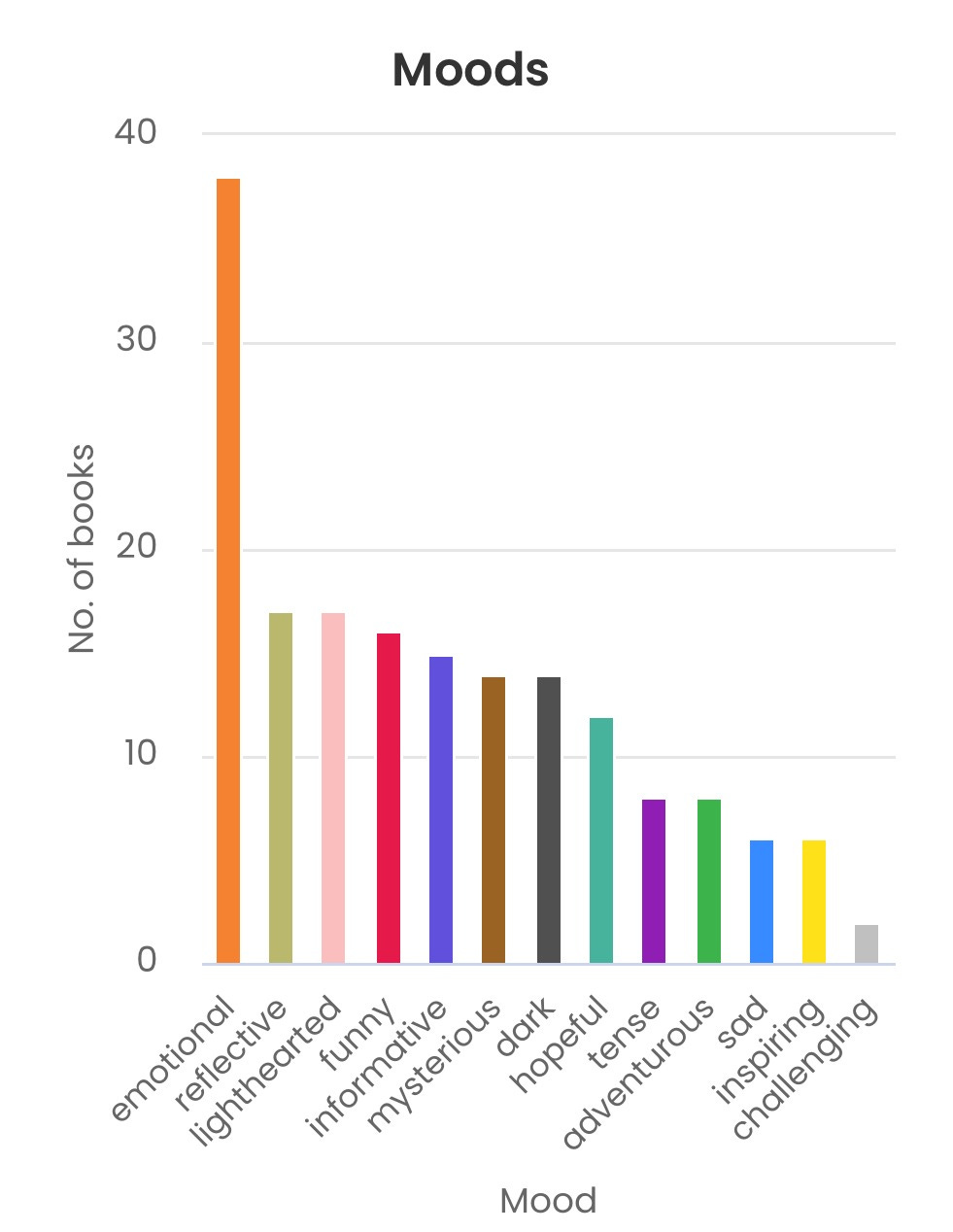 In 2024, my top reading moods were emotional, reflective, funny and informative. Lighthearted moved further up this list in 2025 and relaxing did not appear on in my 2025 mood list at all. Which is fair because 2025 did not feel very relaxed!
