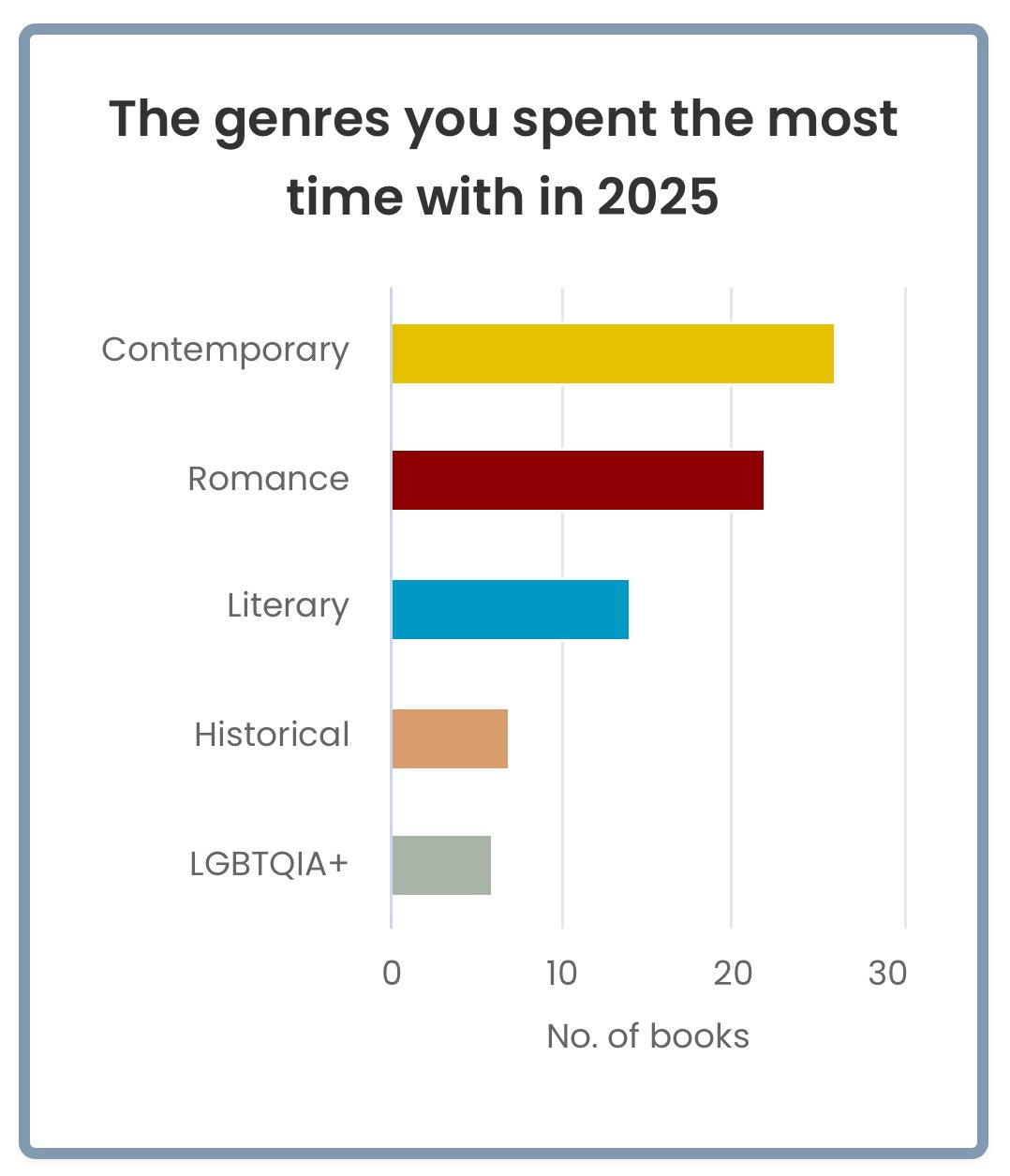 As with 2024, my top genre for 2025 was contemporary with 26 books falling under this category. Romance, literary, historical took the next three spots with LGBTQIA+ being the fifth highest genre.