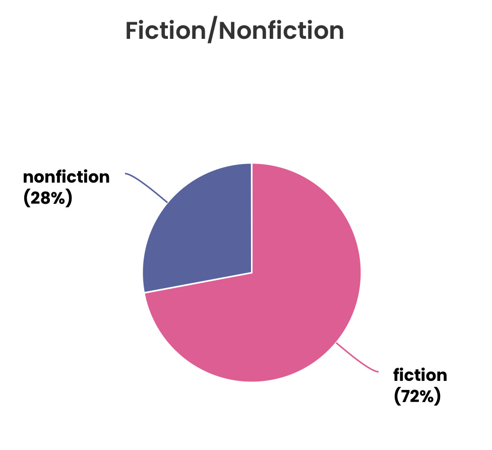 I try to balance my reading by reading one fiction and one nonfiction book at a time. The nonfiction books generally take me longer to finish than the fiction books. In 2025, I read 72% fiction (49 books) and 28% nonfiction (19 books). My fiction/nonfiction split was slightly better in 2024 at 66% fiction (55 books) and 34% nonfiction (28 books).